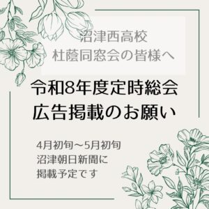 【杜蔭同窓会 定時総会広告掲載のお願い】 杜蔭同窓会では、5月24日(日)に開催される令和8年度定時総会に向けて、沼津朝日新聞に掲載する広告を募集しております。 本広告は、同窓会定時総会のご案内を目的としたもので、同窓生の皆さまの事業やお店、活動などを、地域の皆さまへお伝えする機会となります。 事業者さまだけでなく、個人の皆さま、または部活動ごとの思い出やメッセージを込めた掲載も可能です。 ■ 広告掲載料:1枠 3,000円〜 ■ 募集締切:3月末(予定) 掲載内容や広告規格などの詳細につきましては、お問い合わせフォームよりお気軽にお問い合わせください。 同窓生の皆さまのお力添えを心よりお願い申し上げます。